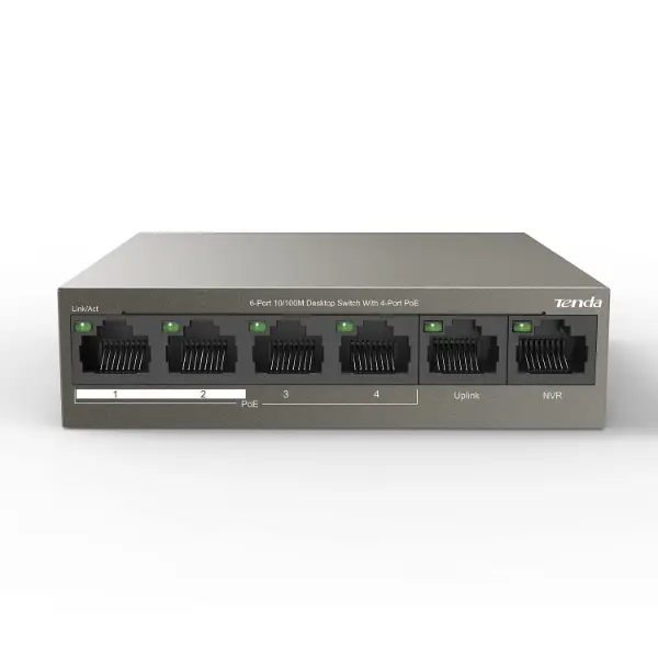 تيندا TEF1106P | محول إيثرنت سريع غير مُدار بستة منافذ، بسرعة ١٠/١٠٠ ميجابت في الثانية، مزود بأربعة منافذ PoE بقوة ٥٨ واط | سطح مكتب وحائط | موزع إيثرنت بدون مروحة | جاهز للتوصيل والتشغيل | معدن متين | حماية محدودة مدى الحياة